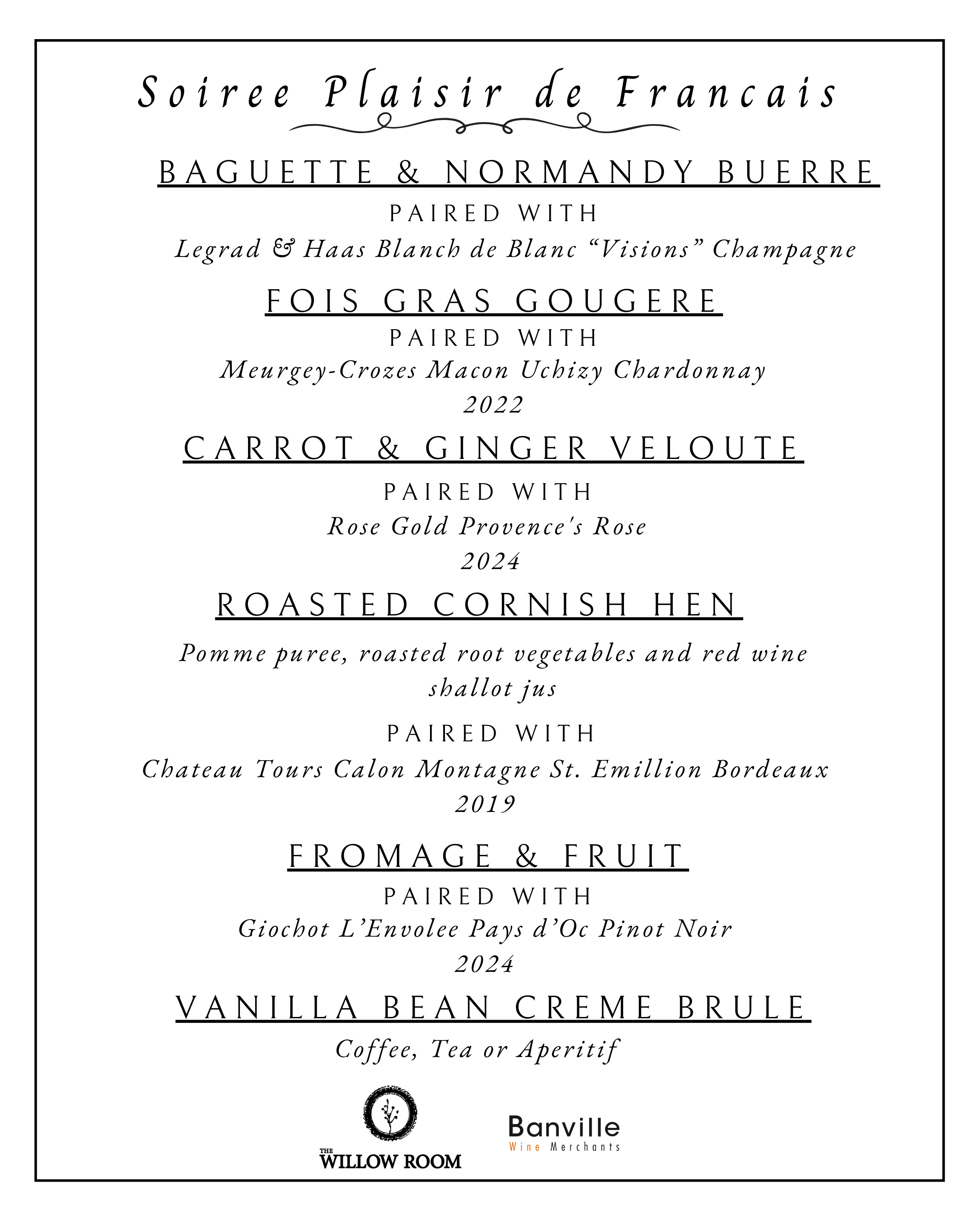 Soiree De Plaisir Francais - Multi Course French-inspired meal paired with 5 wines presented by Banville Wine Merchants